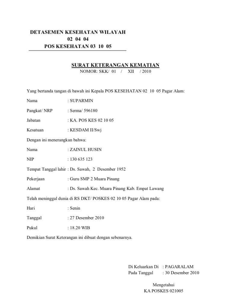 Contoh surat keterangan kematian 2 adalah surat keterangan kematian yang diterbitkan oleh dinas kependudukan dan catatas sipil (disdukcapil), yang biasa digunakan untuk mengajukan pencairan dana asuransi jiwa, pembagian hak waris, dl. 7 contoh surat pernyataan dan cara mudah membuatnya. Islam telah meninggal dunia : Winata bin enan salwi tempat, tanggal lahir / umur : 65 tahun jenis kelamin :